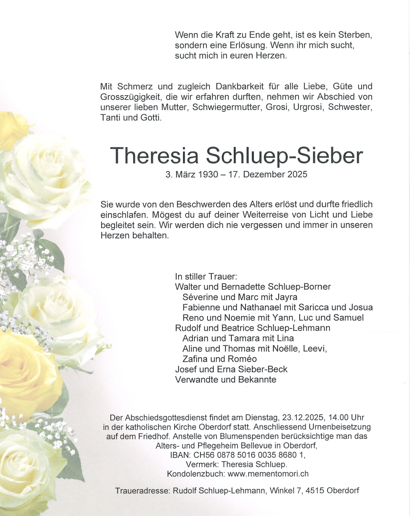 Mit grosser Betroffenheit haben wir vom Hinschied von Theres erfahren.