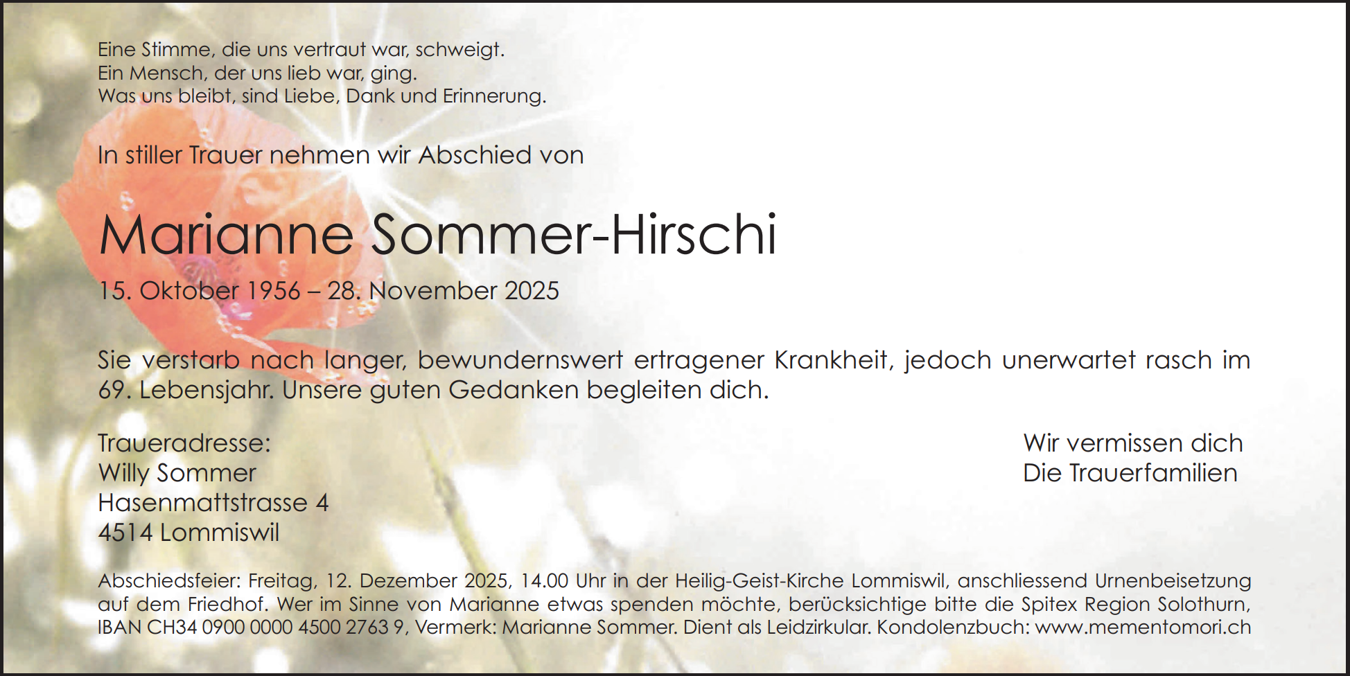 Herzliche Anteilnahme zum Tod von Marianne, möge sie ruhen in Frieden.
