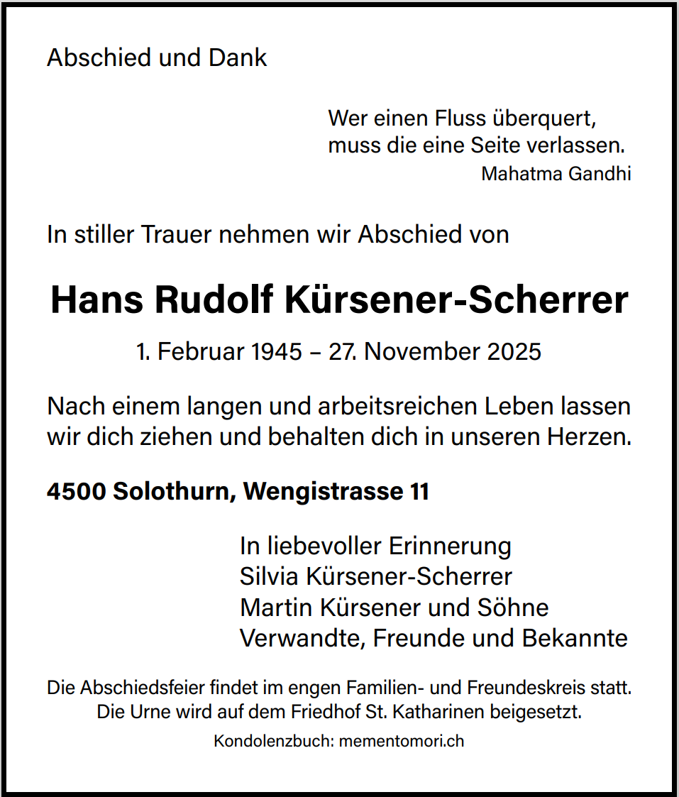 Zum Hinschied von Hans-Ruedi spreche ich dir mein herzliches Beileid aus. Ich wünsche dir viel Kraft und Zuversicht in der Zeit des Abschiednehmens.